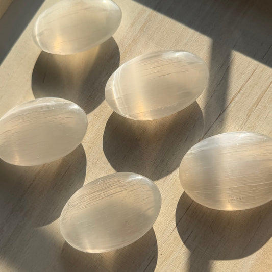 One (1) Selenite / Satin Spar Palm Stone from Morocco