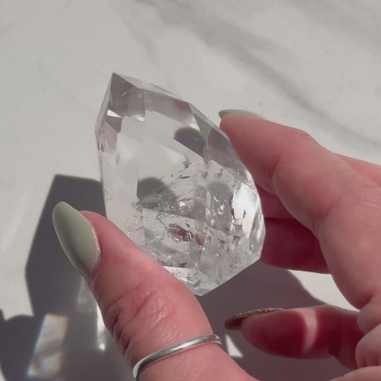 - Material/Type: Clear Quartz (macrocrystalline quartz); polished faceted freeform