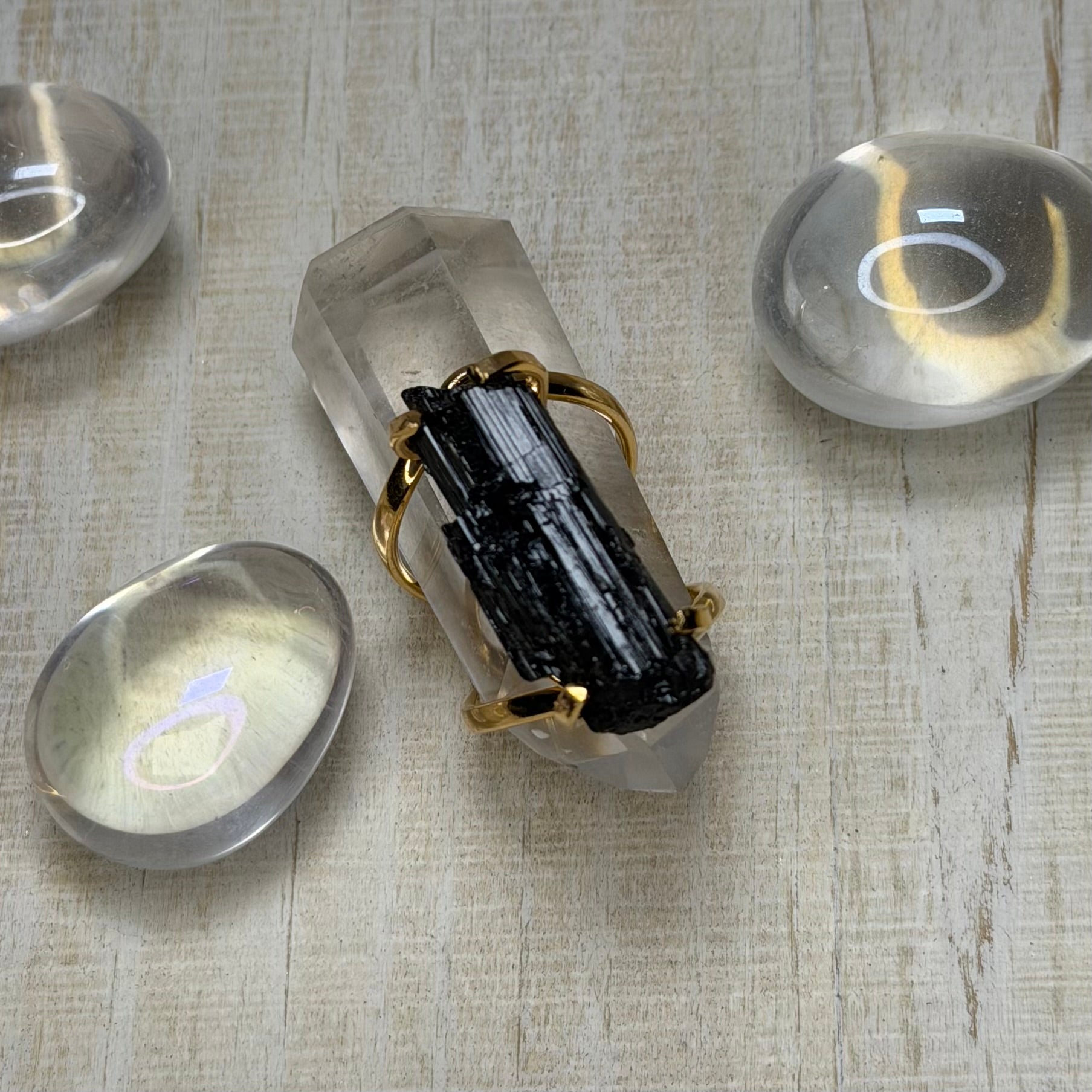 Care: Avoid water, perfumes, and harsh chemicals to preserve gold plating. Store separately to protect the natural crystal.