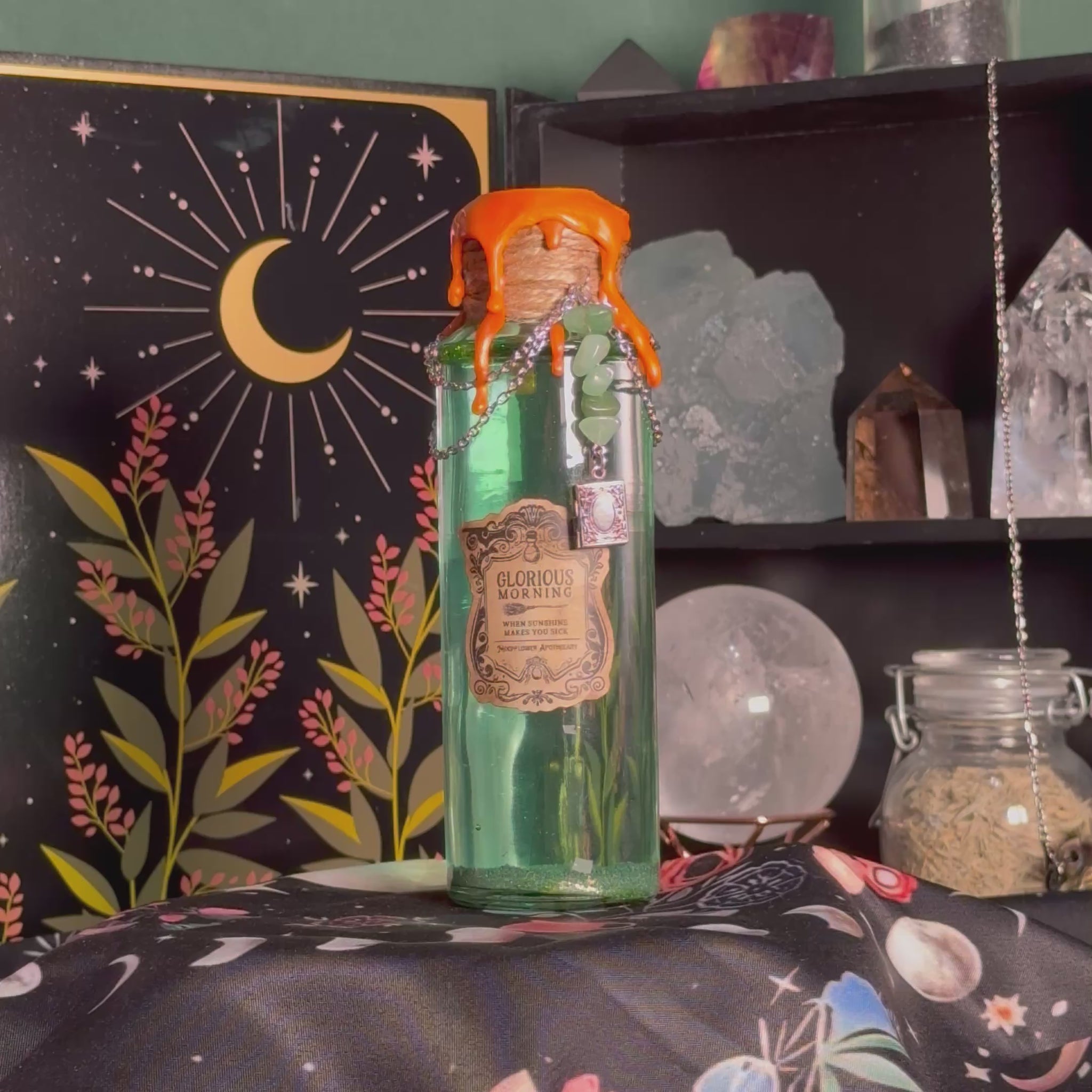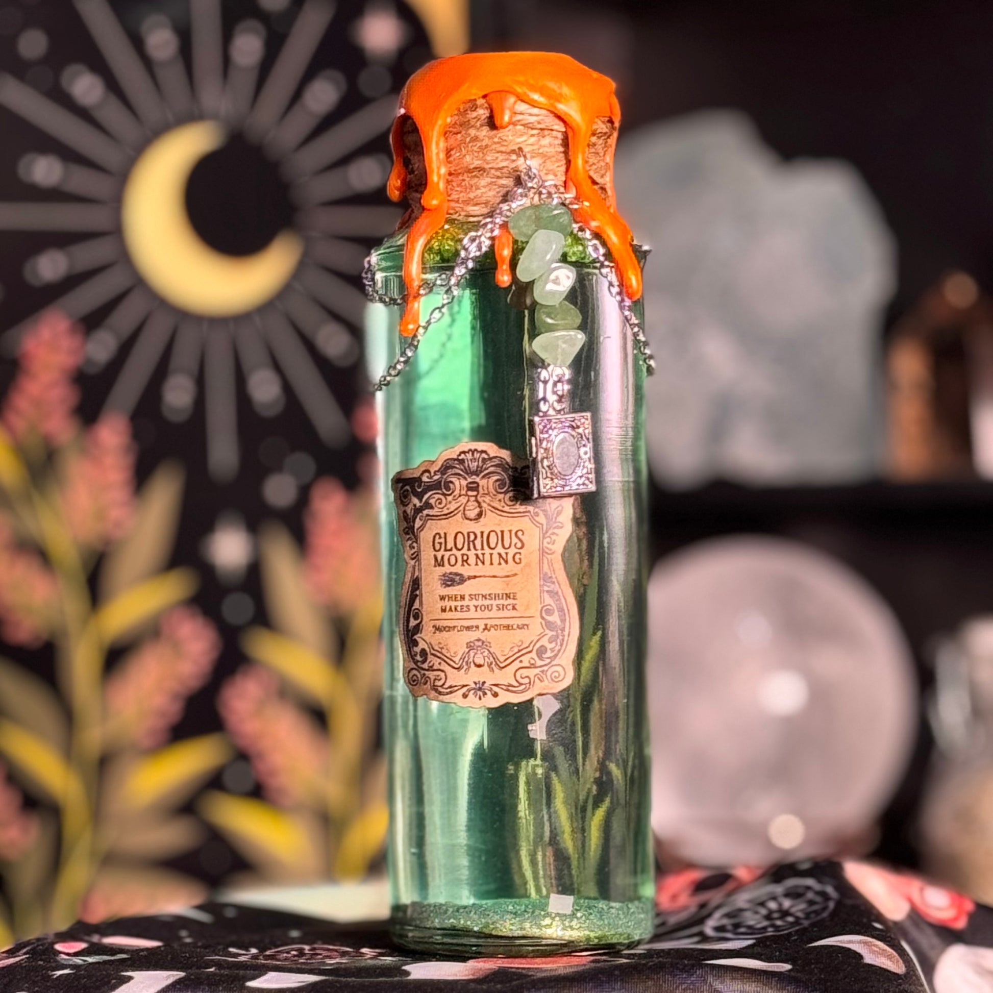 Command your space with the "Glorious Morning" kinetic jar, inspired by the formidable lead of the Salem Sisterhood. A gentle shake awakens deep, swirling mossy green plumes.