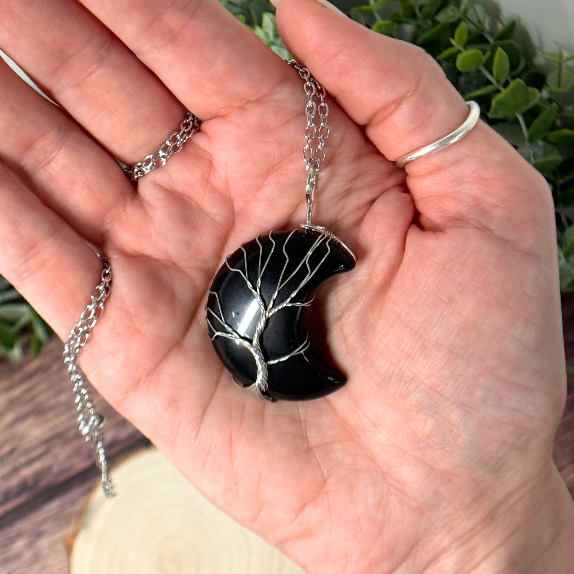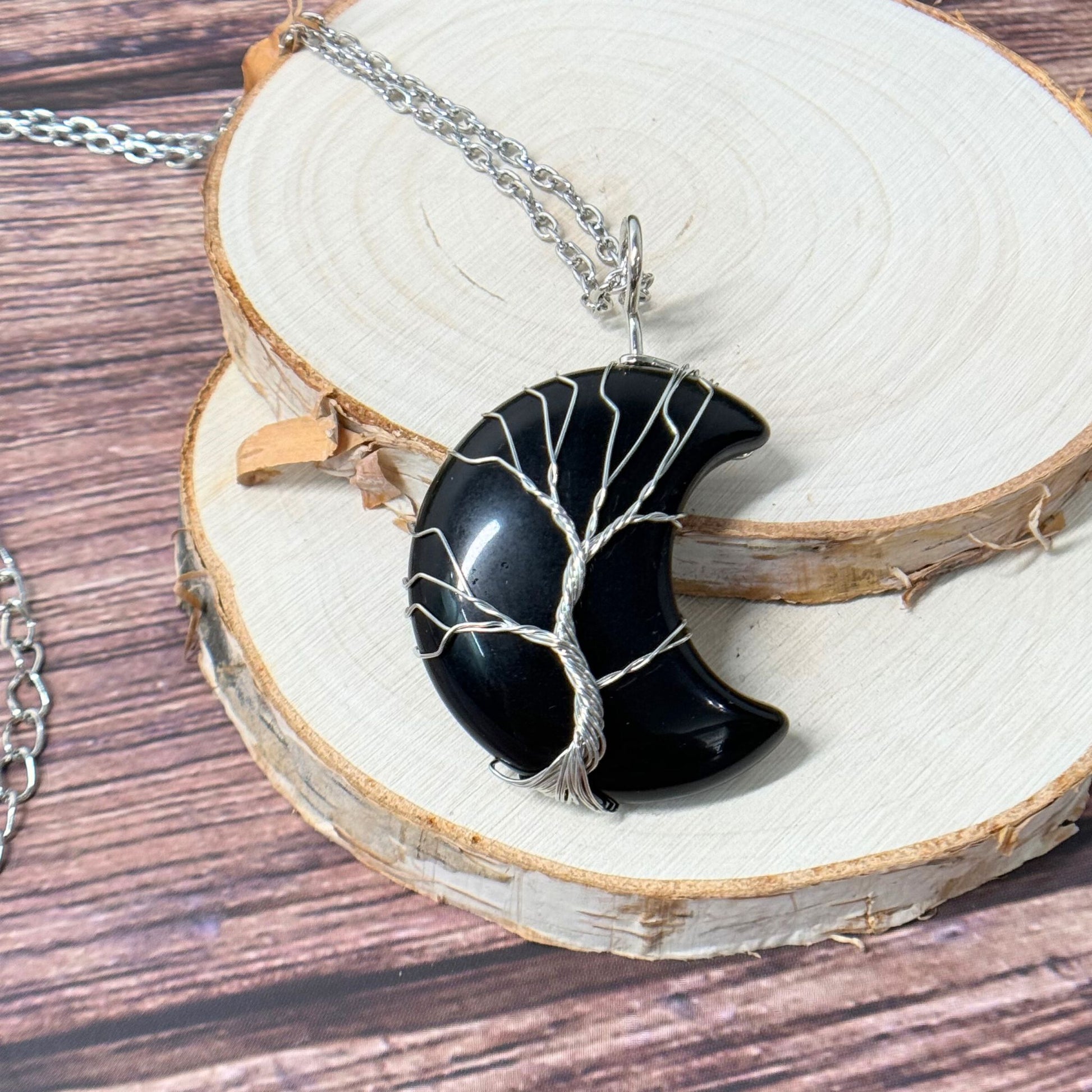 Adorn yourself with our exquisite Silver Wire Wrapped Moon Necklace featuring a striking Obsidian pendant intricately woven with a delicate tree design. This enchanting piece combines the sleek allure of silver with the protective energies of Obsidian, creating a harmonious blend of style and grounding. Each necklace is meticulously handcrafted to symbolize protection and connection to the earth, making it the perfect accessory for those seeking to shield themselves from negative energies and find inner stability.