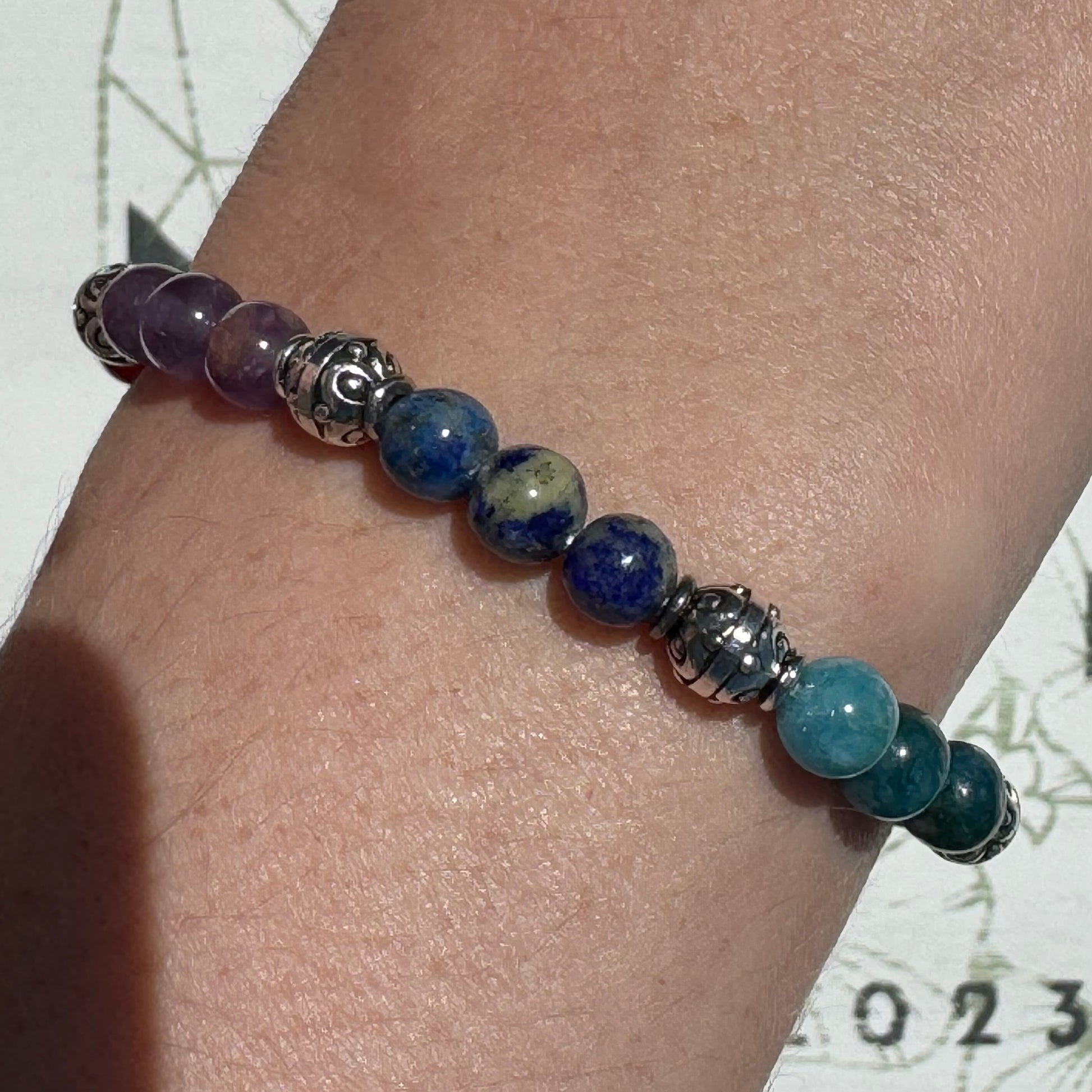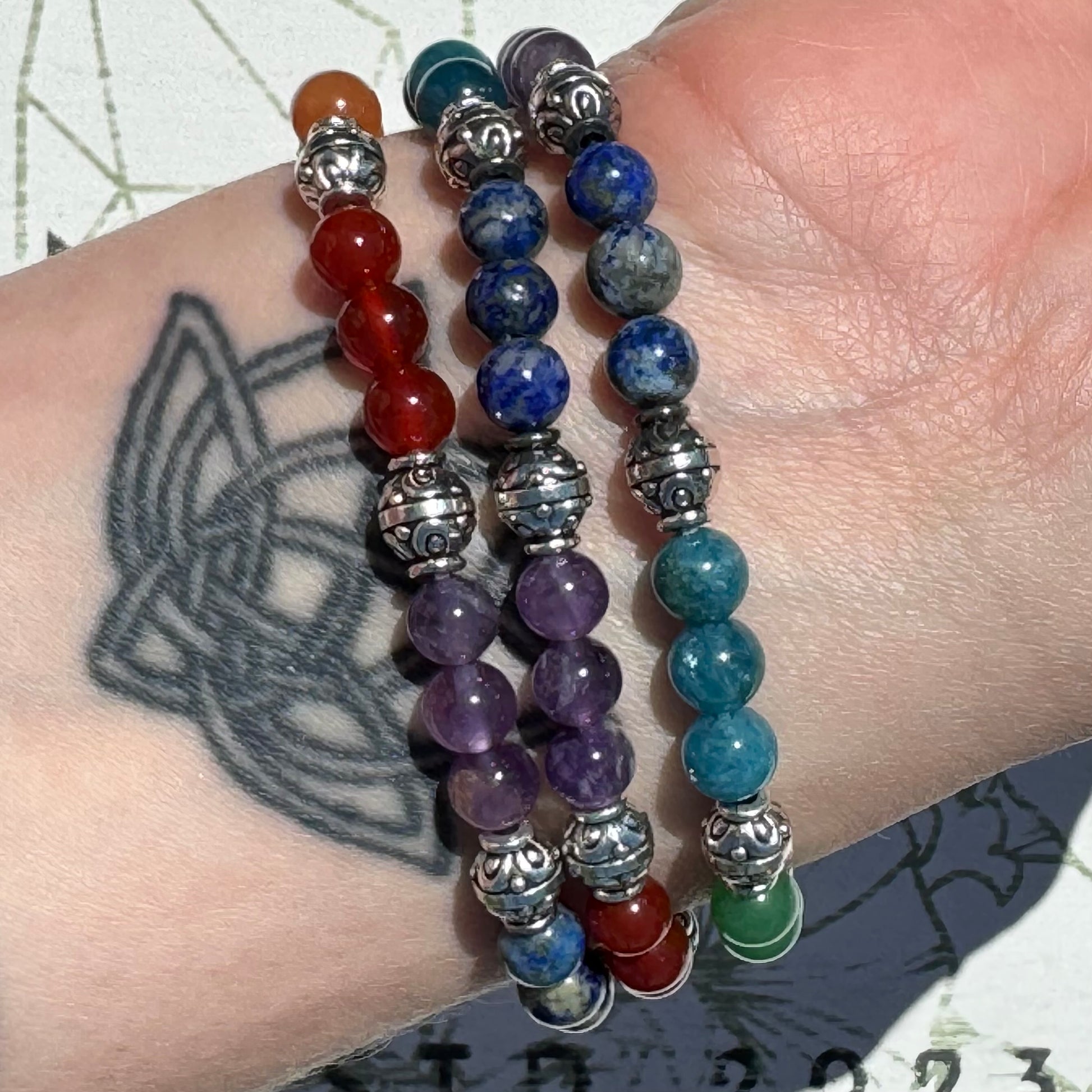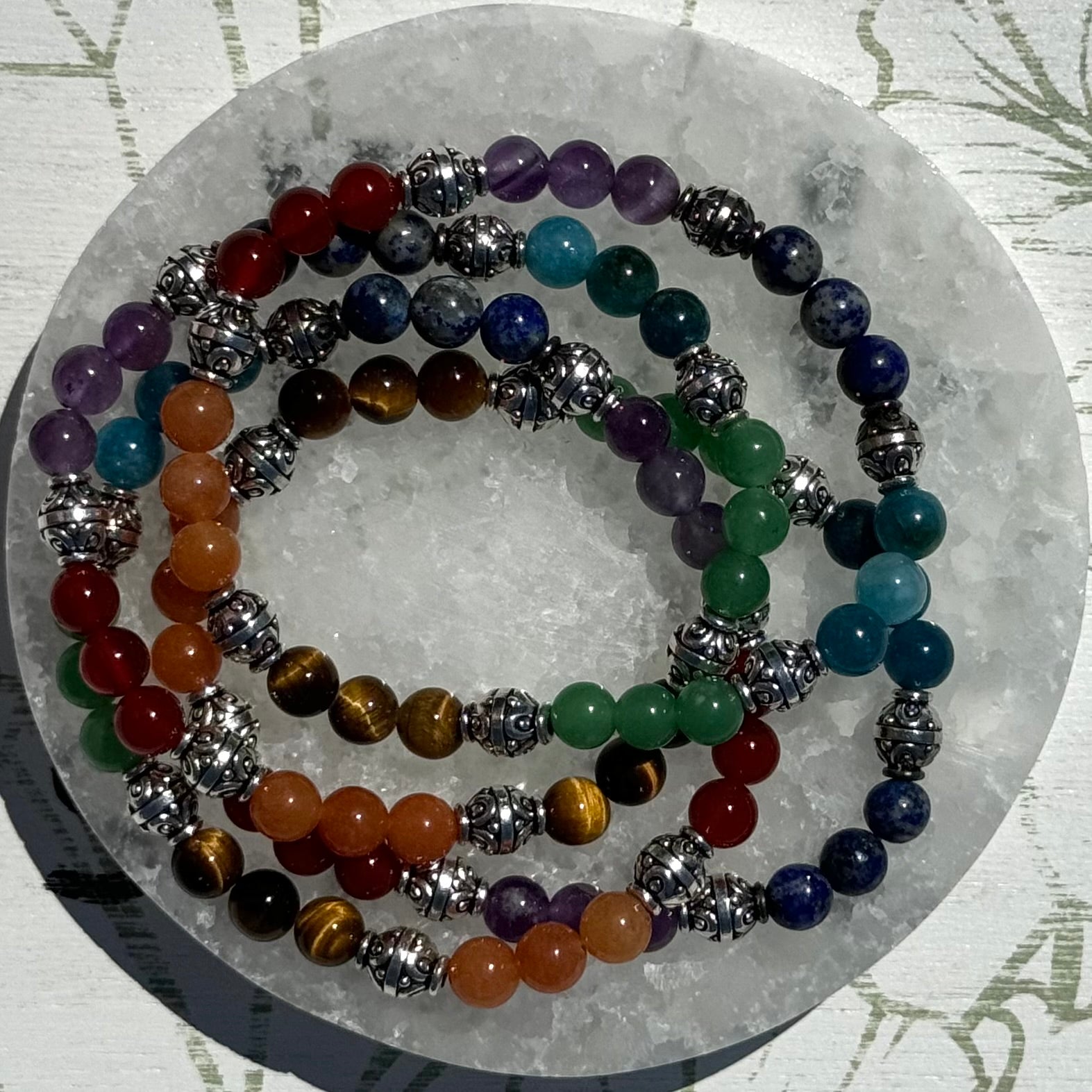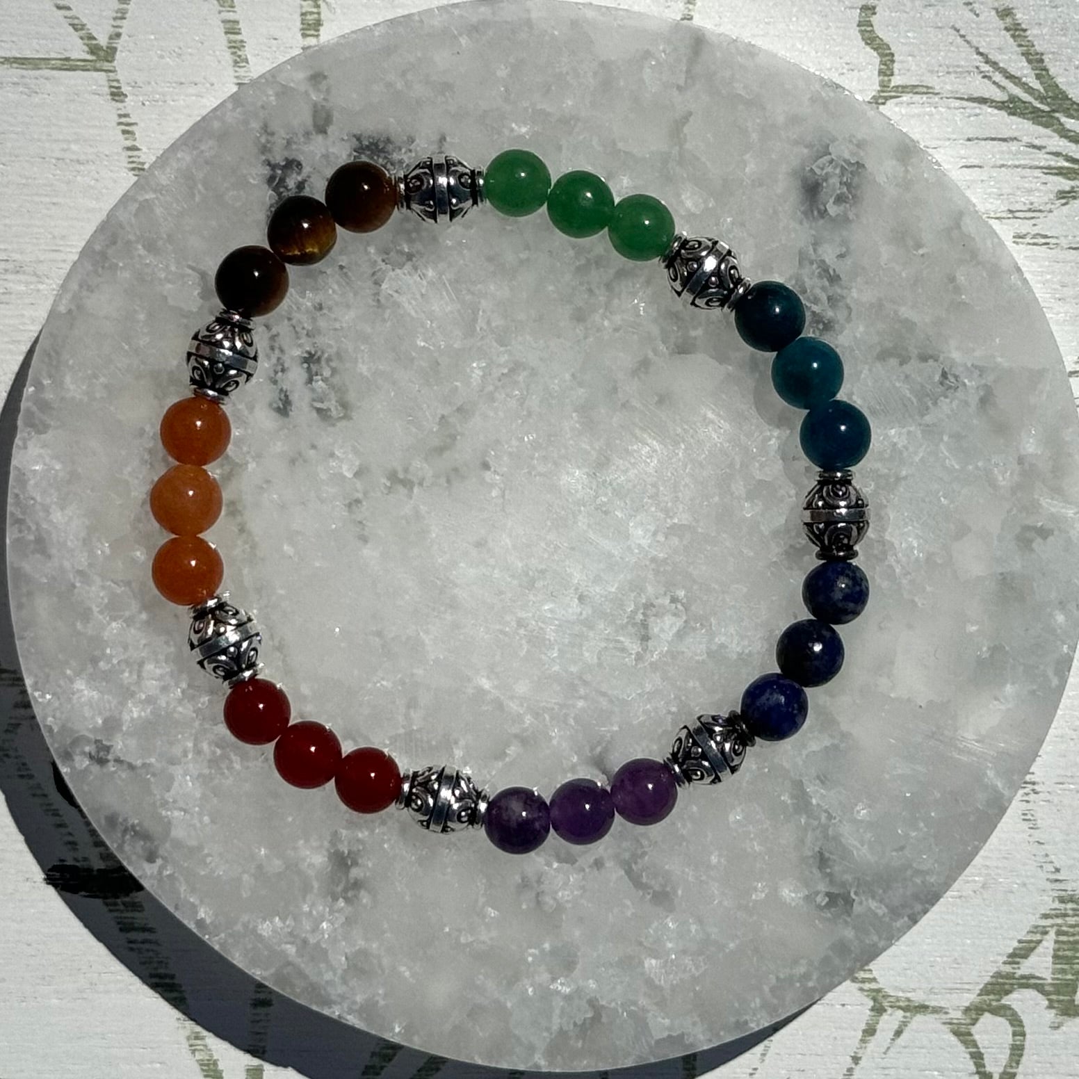 This elegant silver Chakra bracelet features 6mm beads that provide balance, healing, and vitality. Connect with your inner energy as the beads help align and activate your chakras. Perfect for any outfit and a great reminder to focus on self-care and positivity.